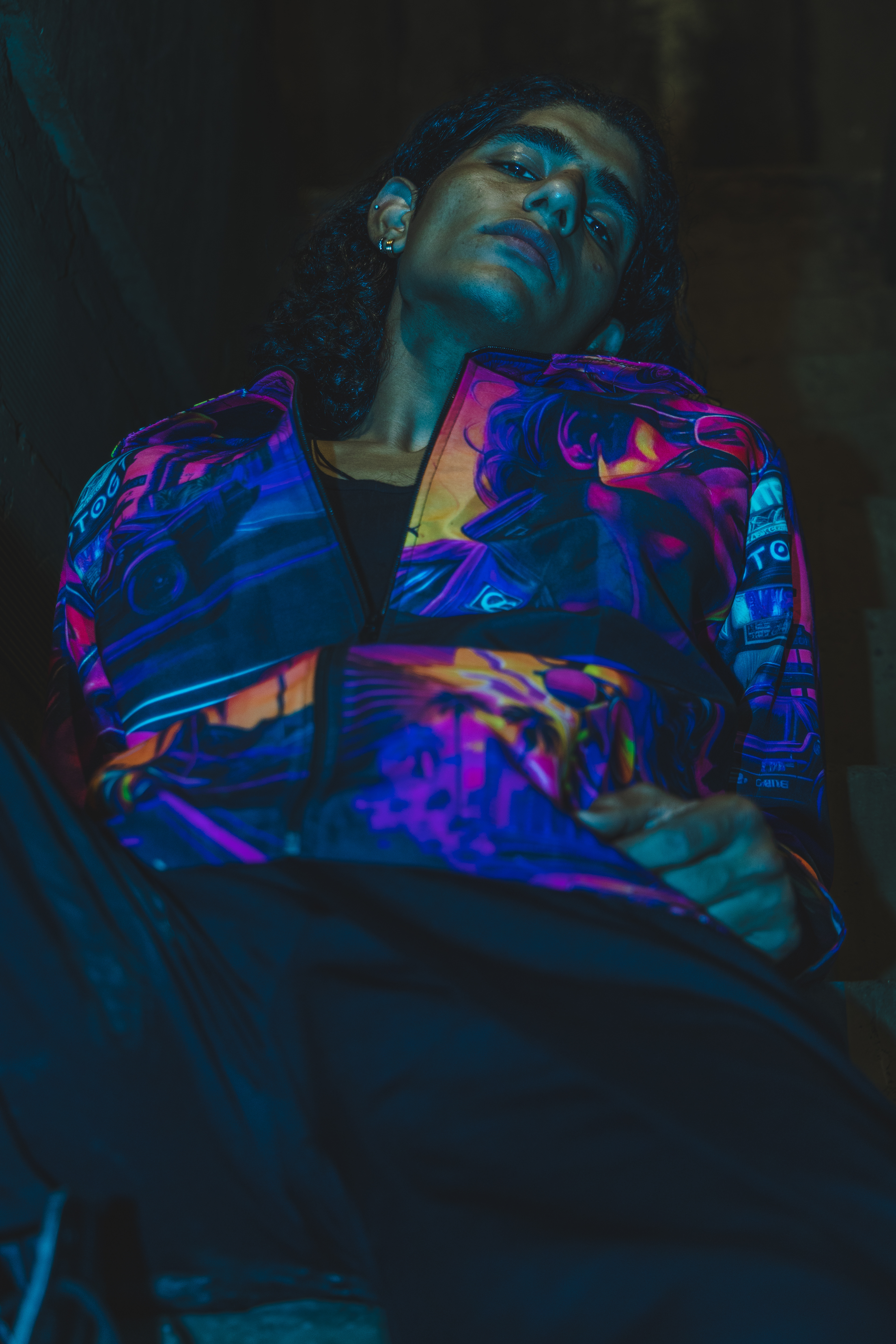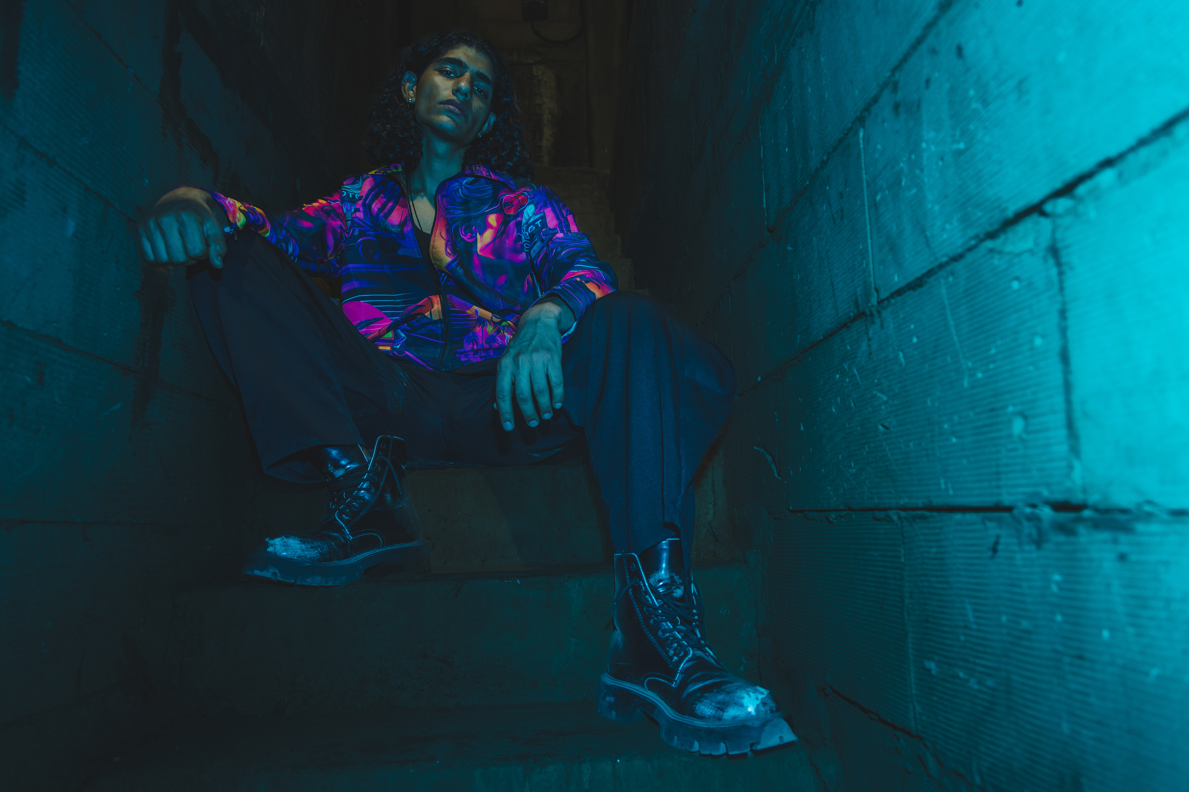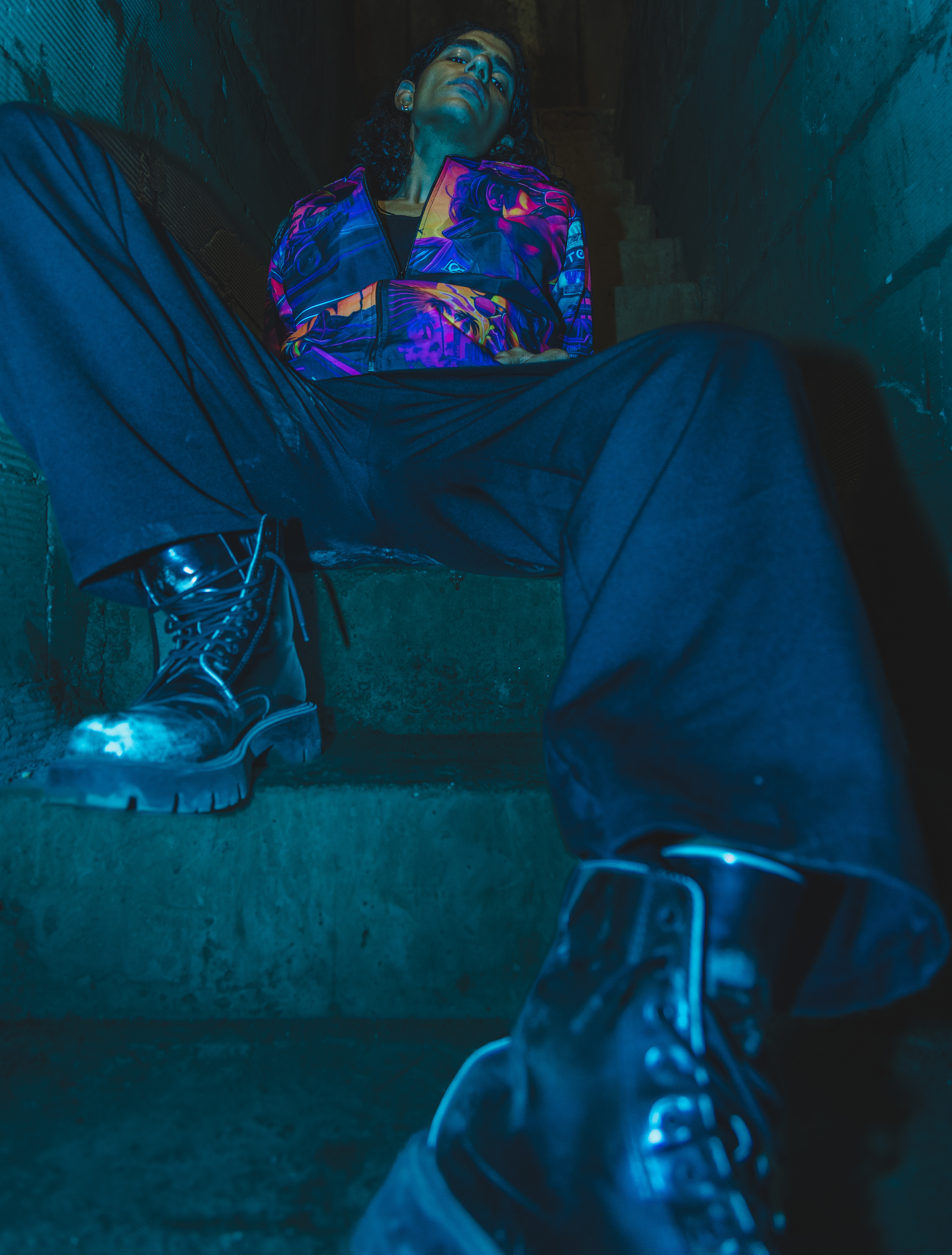 I’d been wanting to try shooting with a blue gel over my flash for a while, just to see what kind of mood it could create. Dim, raw, concrete walls, the kind of space that already feels like it has a story. The moment that blue light hit, the whole place transformed. We moved fast, trying different angles, playing with shadows, letting the vibe lead us. When I saw the images later, I was happy — they had that gritty, electric feel I’d been chasing.
