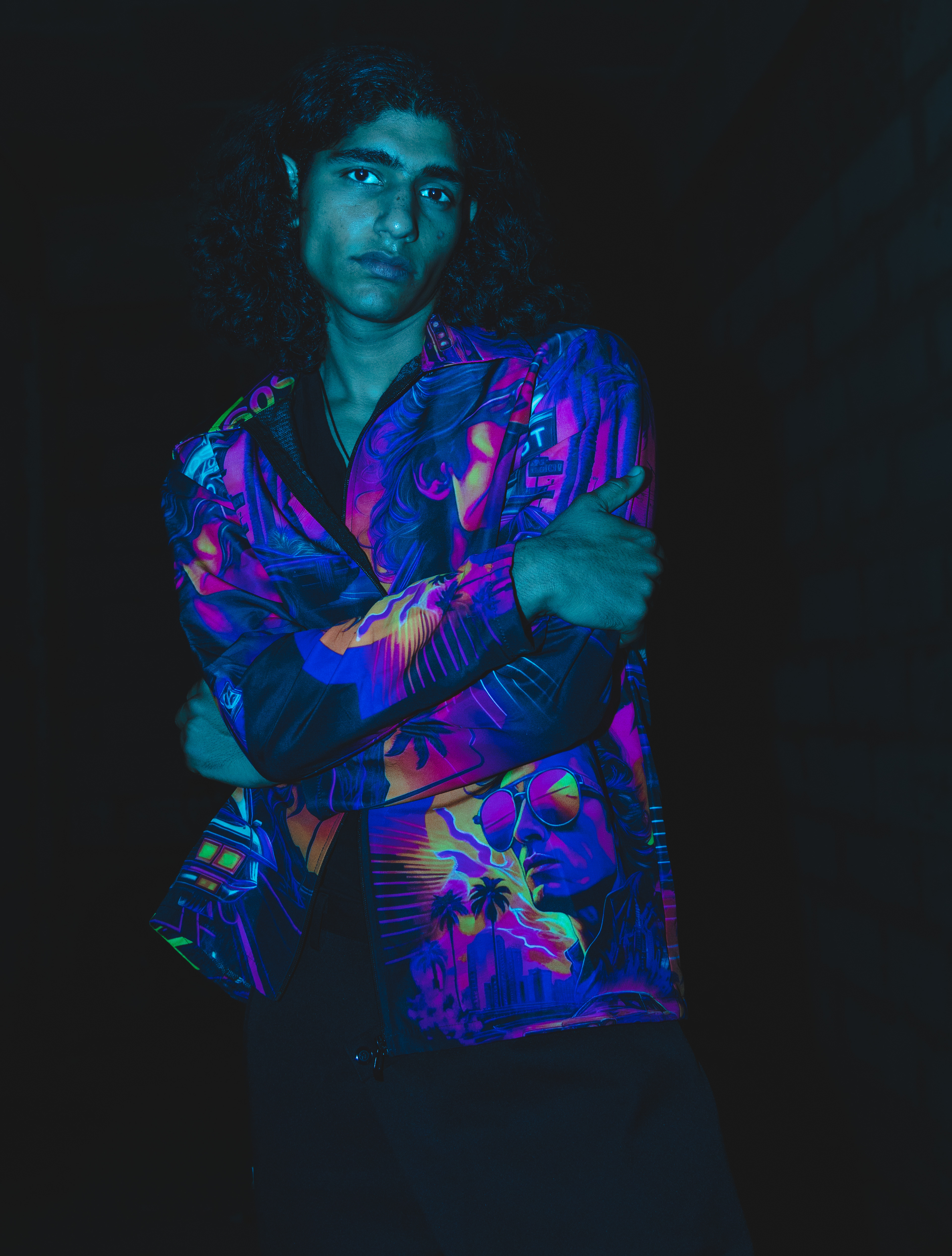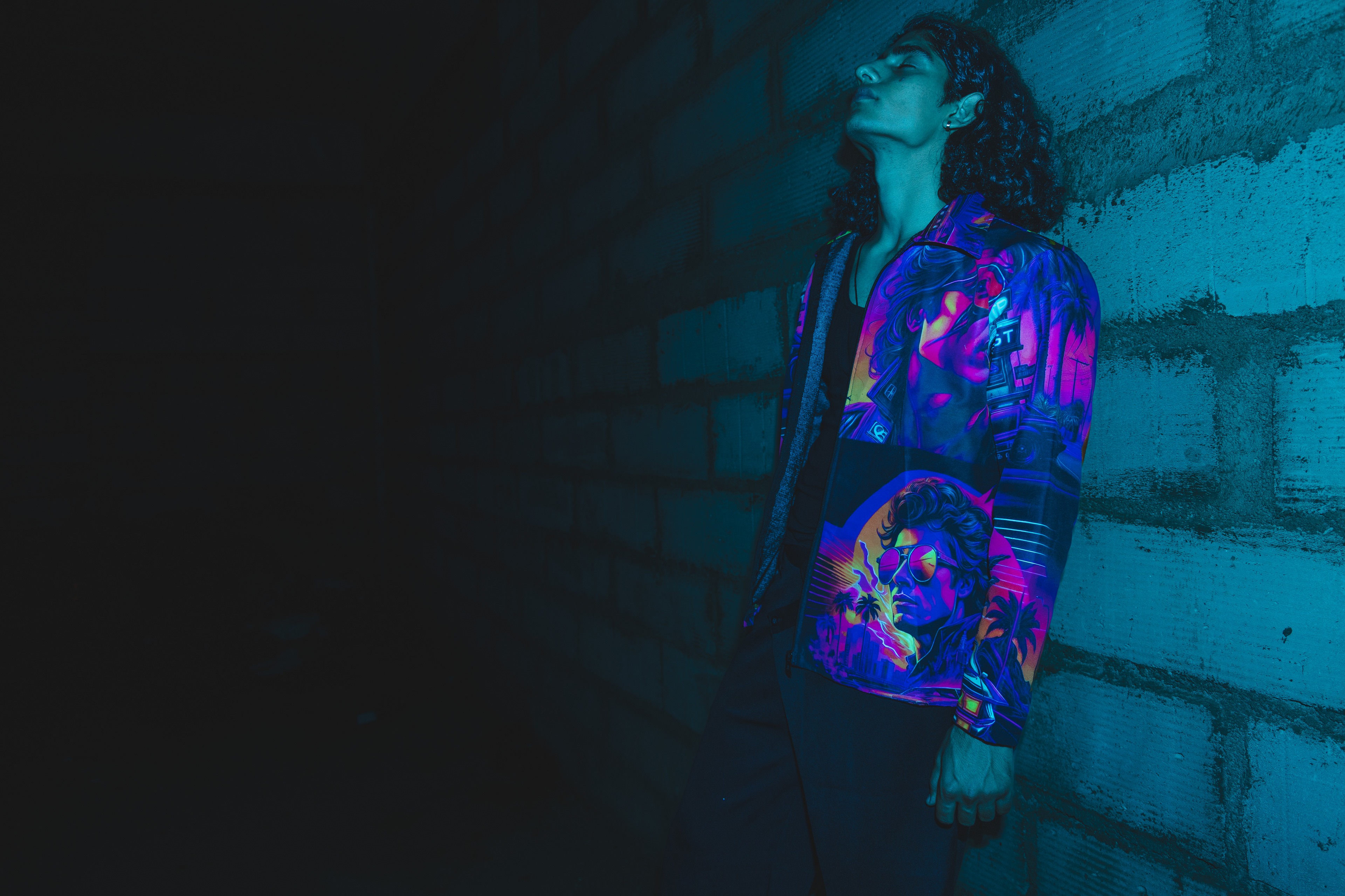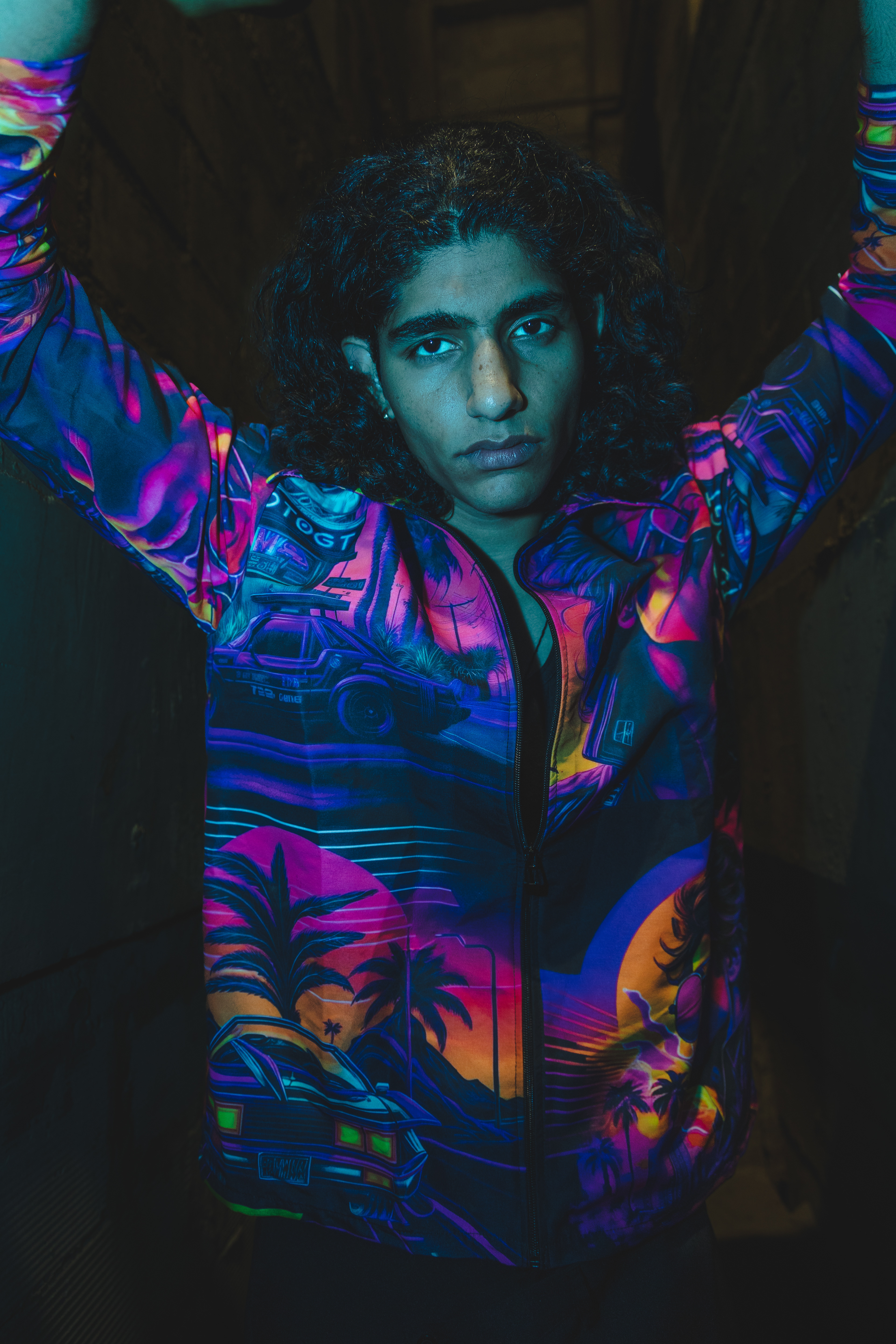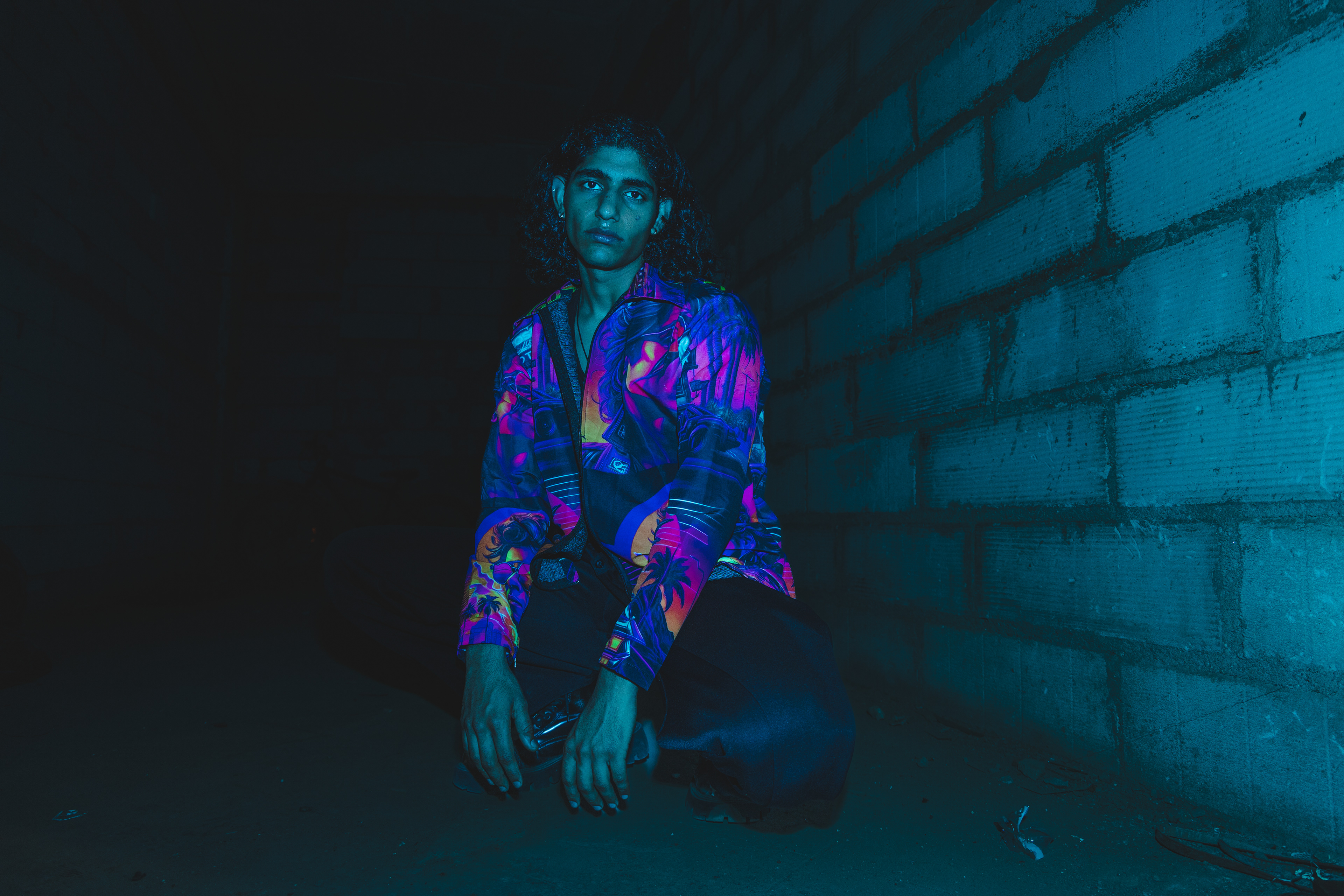 I’d been wanting to try shooting with a blue gel over my flash for a while, just to see what kind of mood it could create. Dim, raw, concrete walls, the kind of space that already feels like it has a story. The moment that blue light hit, the whole place transformed. We moved fast, trying different angles, playing with shadows, letting the vibe lead us. When I saw the images later, I was happy — they had that gritty, electric feel I’d been chasing.