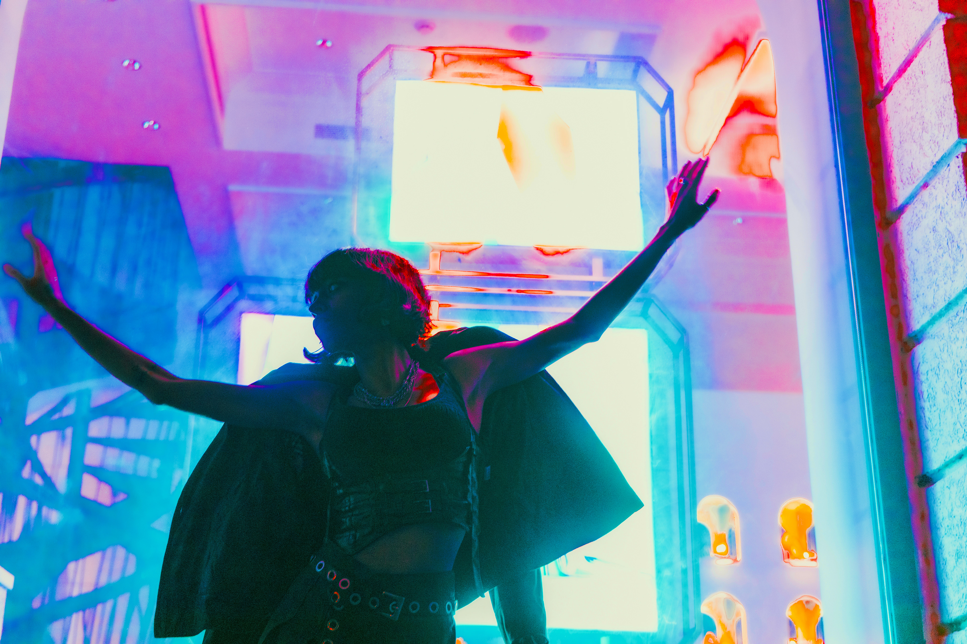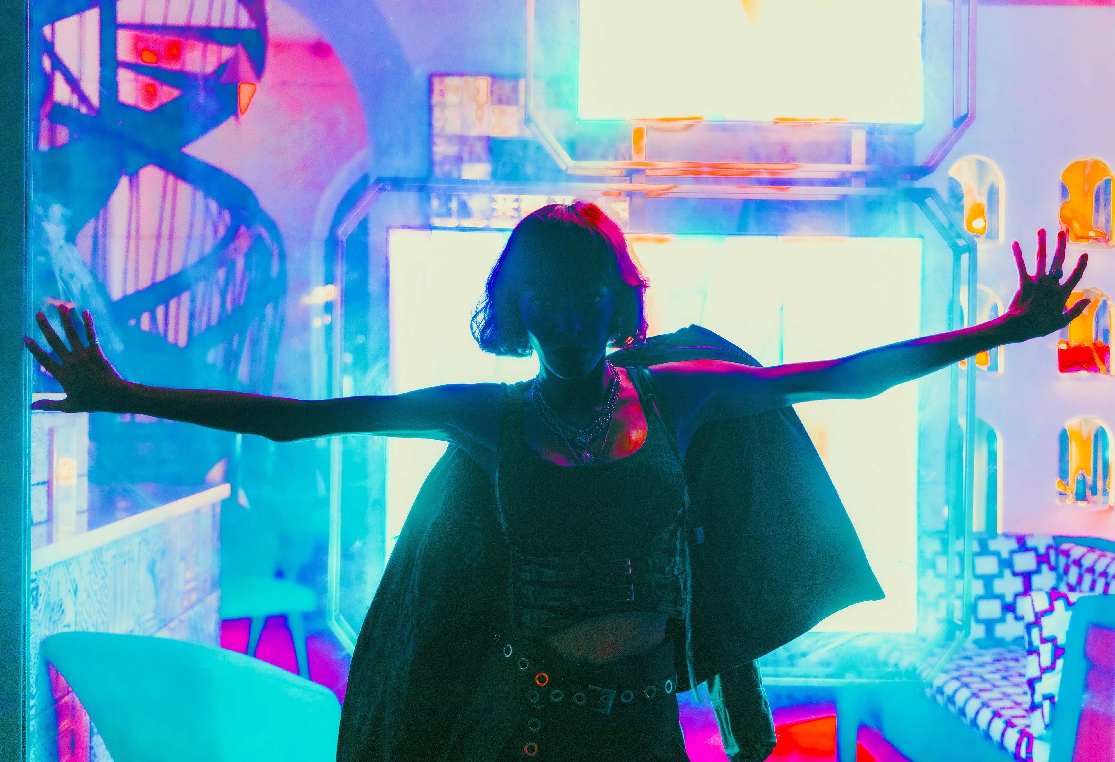 The model, almost shrouded in shadow, embodies the mystery of the night — a reminder that the dark holds stories too. Each hue sparks a narrative waiting to unfold in this electrifying realm.